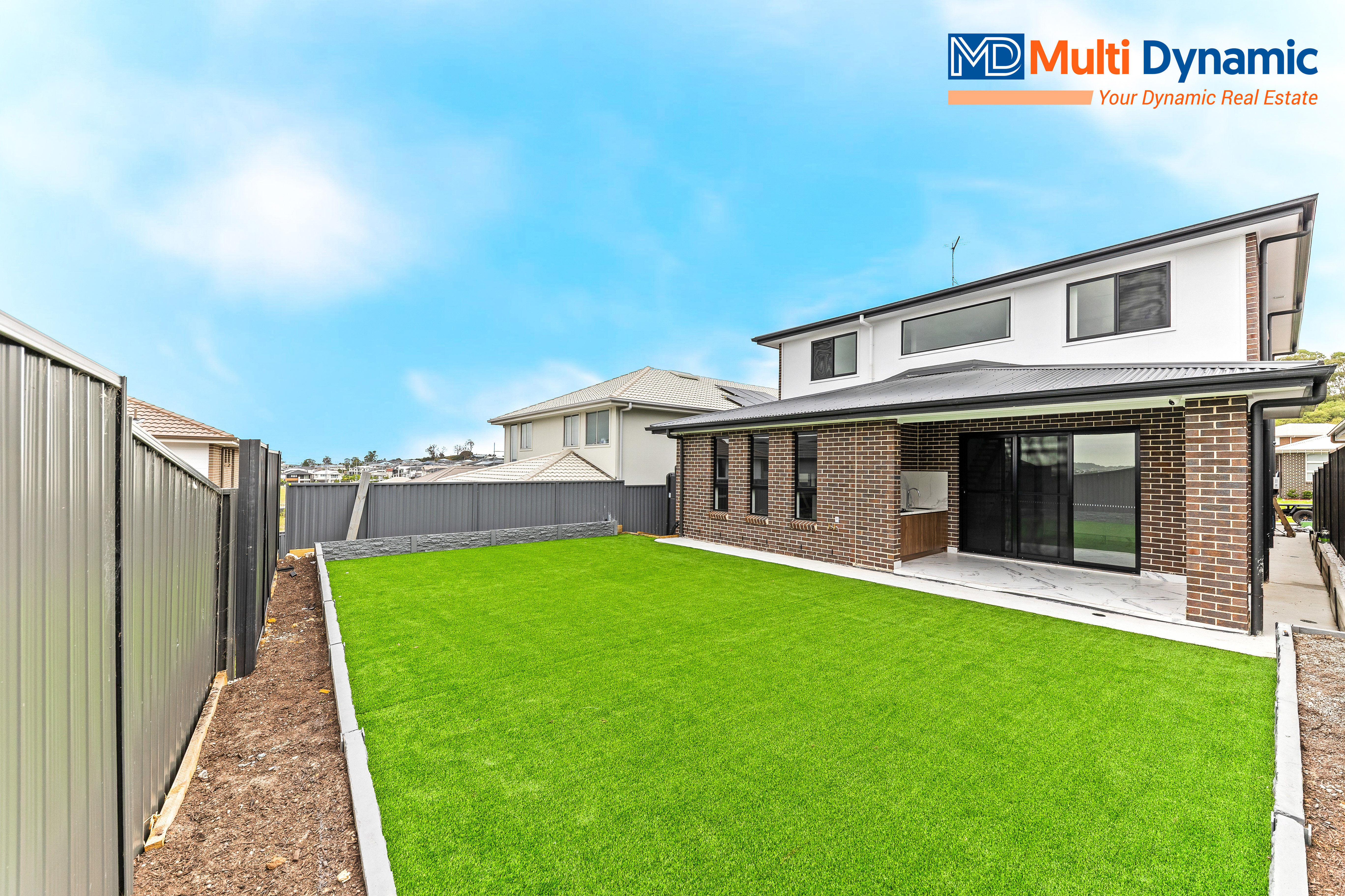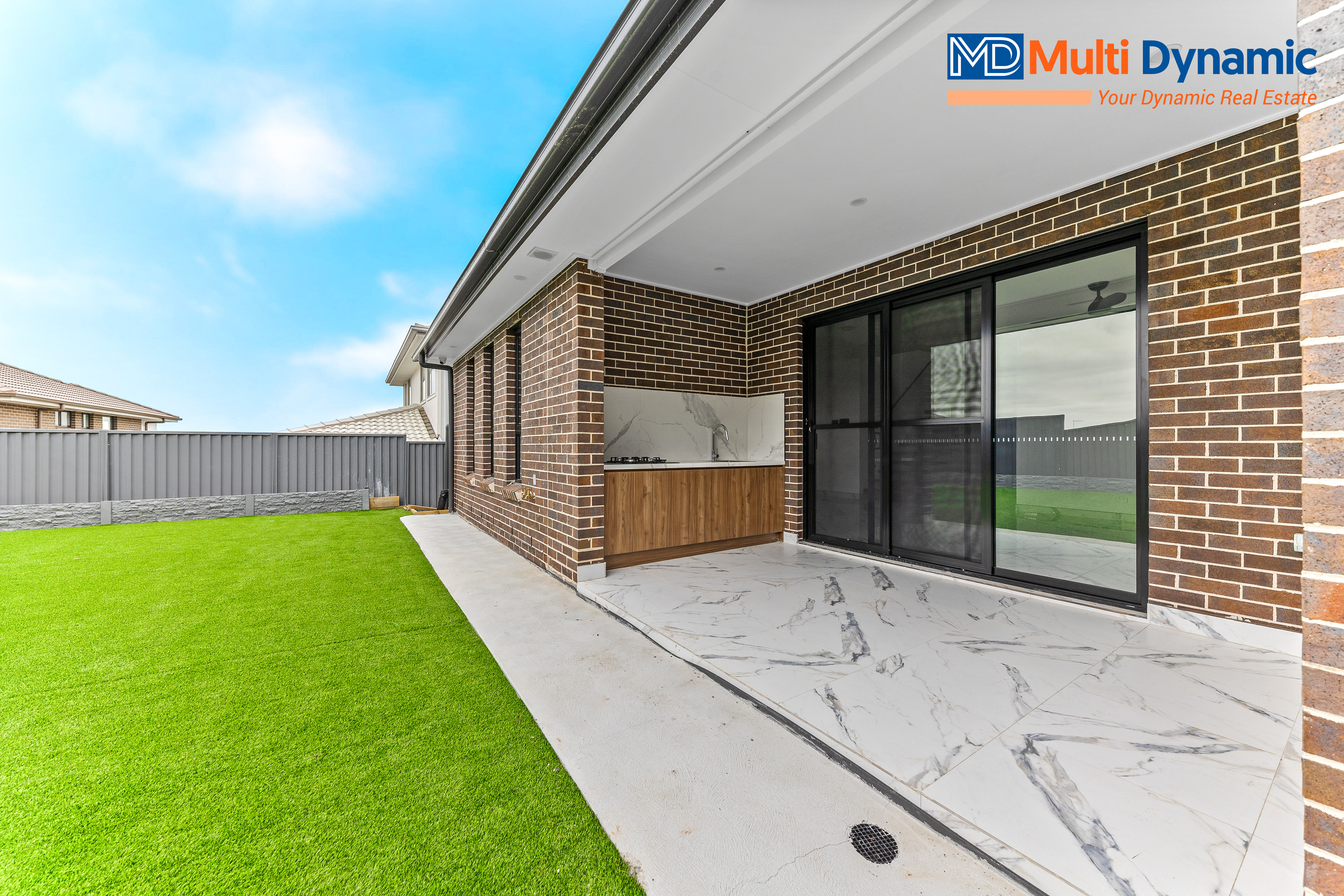 Enjoy seamless indoor-outdoor living with an alfresco area featuring an outdoor kitchen, overlooking a large backyard with low-maintenance artificial lawn.